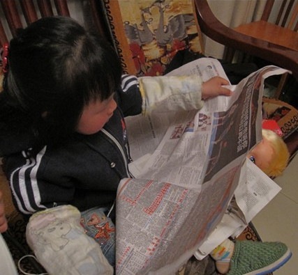 2012年2月16日,小丫头在家里跟着大人一起看报,还有模有样的,被拍下来,做多种文体调侃一下,哈哈。