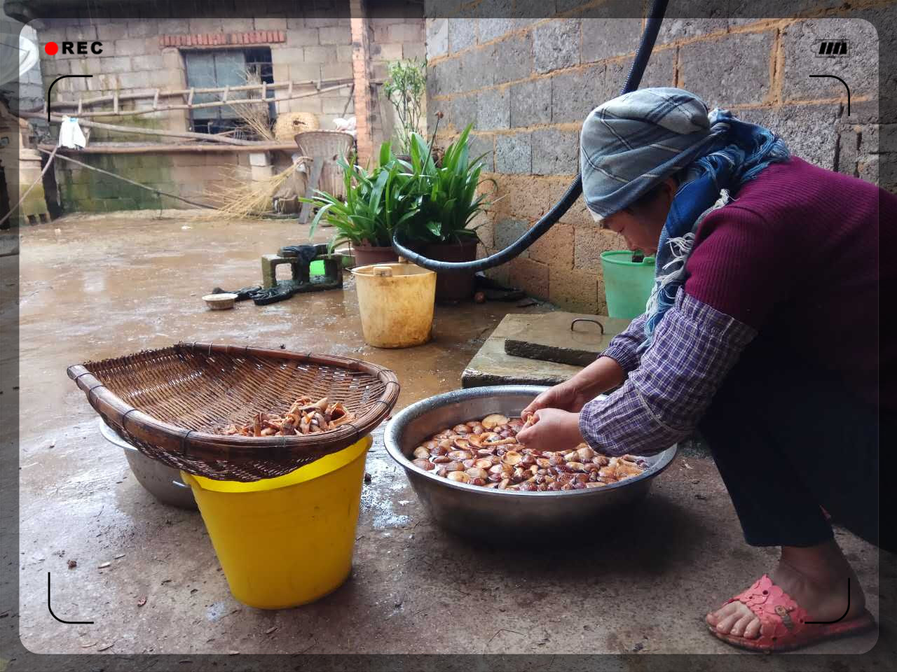 2017年7月14日,山村农妇正在清洗捡来的野生菌,准备做成辣椒油后寄给山外在北京大学就读的女儿。