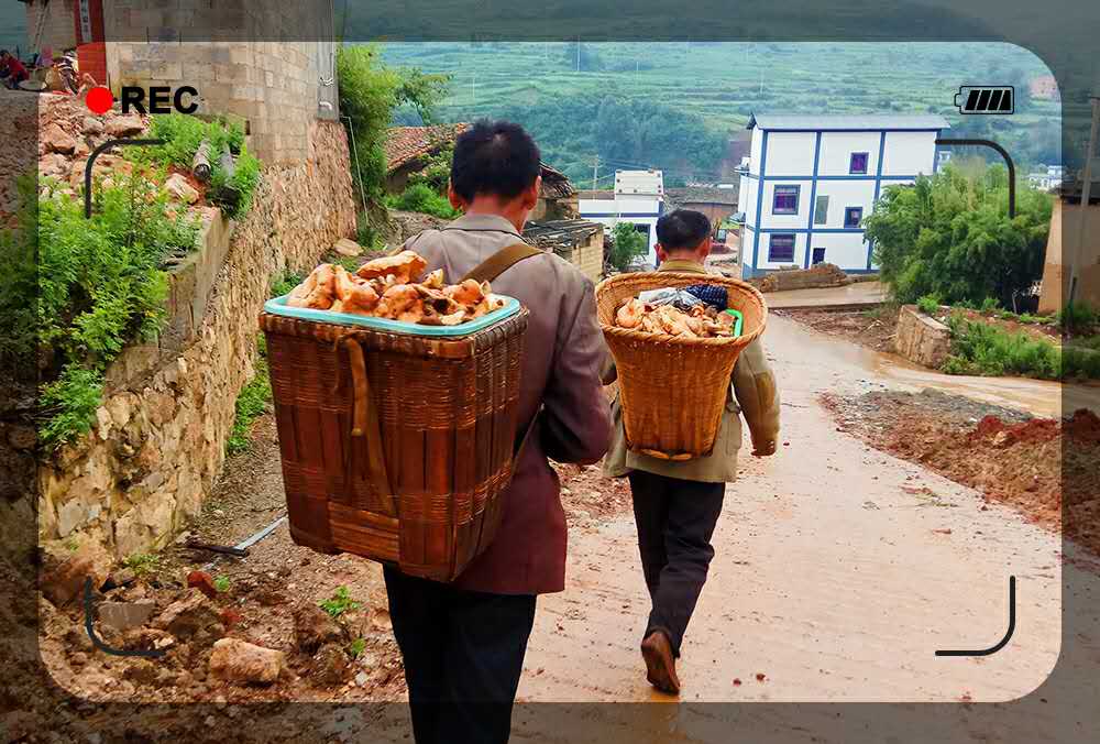 2017年7月14日,两名捡满野生菌归来的村民匆匆走过。