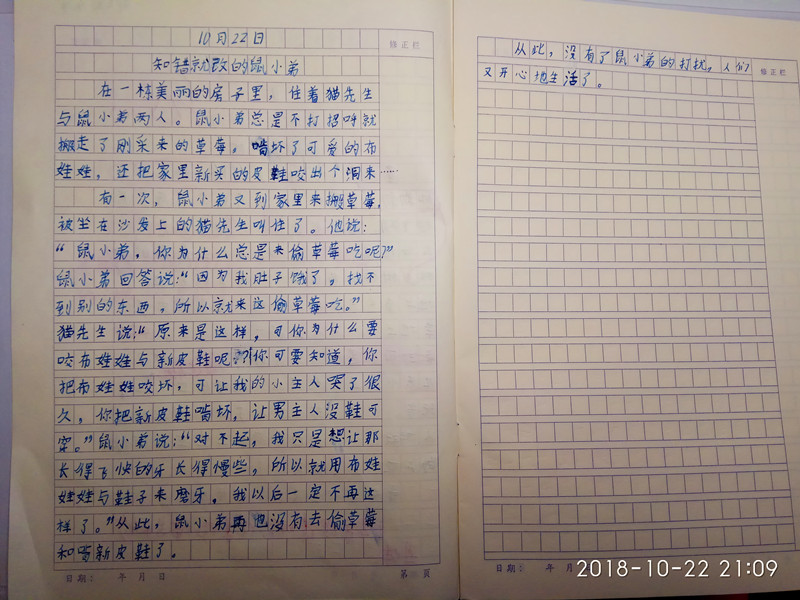 3.第一次用钢笔写作文。如图,题目叫《知错就改的鼠小弟》。