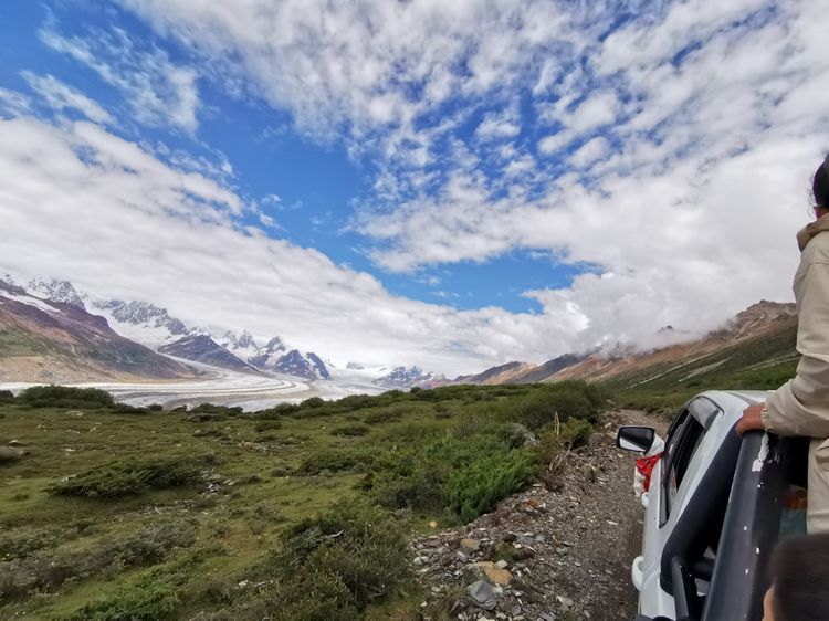 从然乌镇到雅隆冰川的收费是这样,200元的汽车费+100元的摩托车费,雅隆村的车到酒店接人,游览完毕送回酒店再付钱。为了看蓝冰,咬咬牙出发,这也是我们这次最明智的选择。村民的皮卡车带着我们通过来古冰川的景区大门,走上越野道路,爬上悬崖上的山路,前往雅隆冰川。