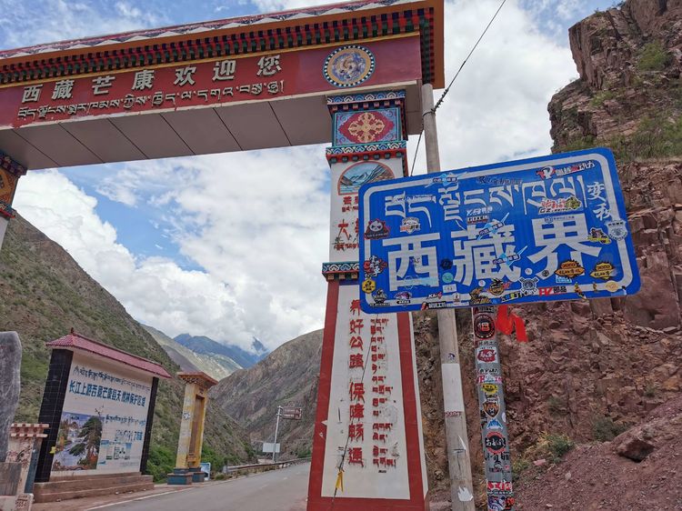 从飞来寺一直下坡、下坡、下坡,海拔降到了2000多米,再沿着炎热的澜沧江河谷跑上2个小时,终于到了云南和西藏的交接,叫隔界河。这里立着个西藏界的标志牌,已经被全国的游客打满了卡。这个地方要非常小心,虽然是国道,车来车往,西藏和云南交警都心有灵犀的各自装了摄像头,依然挡不住全国各地的游客站在大路中间各种花式打卡。15天后我们返回云南再次经过这里时,正好遇到一辆皖A的大巴,拉了一车红红绿绿的大妈,在国道上或跑或走或滚的各种姿势拍视频,场面颇为壮观。。。。