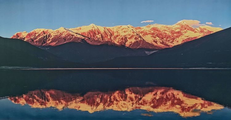 蓝天白云倒映在蓝色湖水中,远处是雪山。