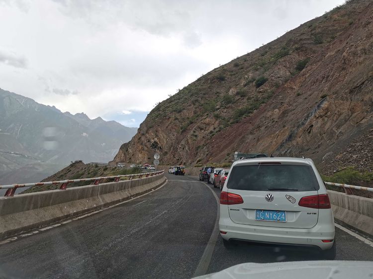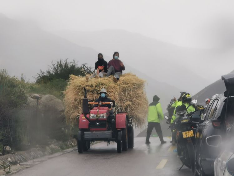 离八宿县城几十公里时候堵车了,一堵就是4个多小时,原计划是住左贡,现在只能住八宿。堵车时候又下大雨,村民开着拖拉机拉着青稞走过长长的堵车队伍,摩托手们与拖拉机上的女孩打招呼,女孩笑着挥手回应。