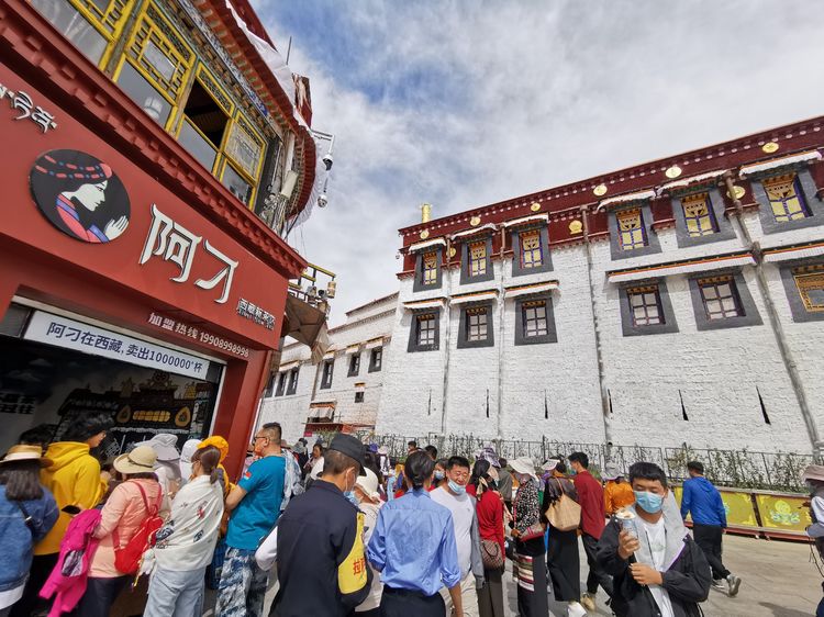影楼选完照片,来到大昭寺。大昭寺也要提前一天预约,我们搞忘记了(大昭寺还是好预约的,只是要提前一天),只能逛八廓街了。大昭寺门口就是张韶涵唱的歌曲《阿刁》的同名奶茶店,之前我不知道阿刁是奶茶店,还根据歌词内容用来教育孩子要努力学习改变命运。到现场才知道,一杯奶茶几十块,一天上千份,几个店,一年营业额几千万。。。阿刁可是亿万富翁,怎么可能吃不起饭。。。武断了。。。
