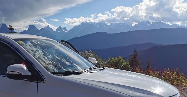 进入西藏后翻的第一座大山叫红拉山,海拔4448米。从盐井检查站到山顶,是35公里的上坡路。爬到山顶,远处就是连绵的雪山,倒映在车身上,有进藏的感觉了。