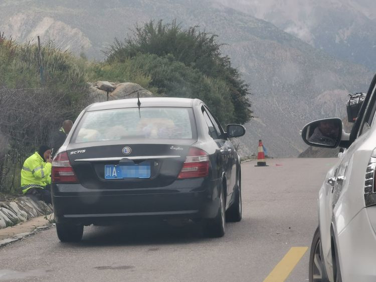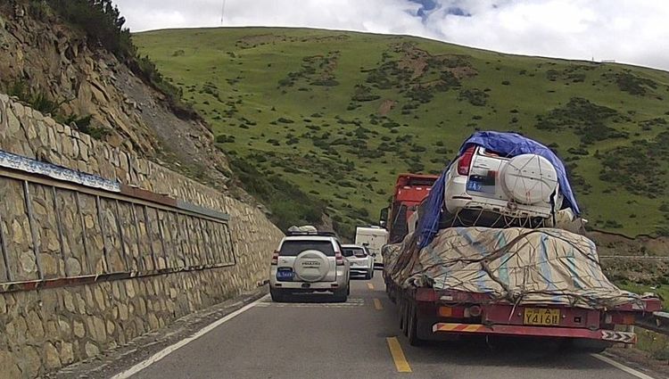 这辆大车背着2辆云A的车,从林芝往昆明走,我们连续3天都遇到了,看上面H9的车头状况,应该是发生了事故,背回昆明修的。大车也辛苦,我们每天都是9点出发,可大车都已经走出了几十公里,本来大车就走得慢,可见是天黑休息,天亮就出发了。希望小车车主没事,平安就好。