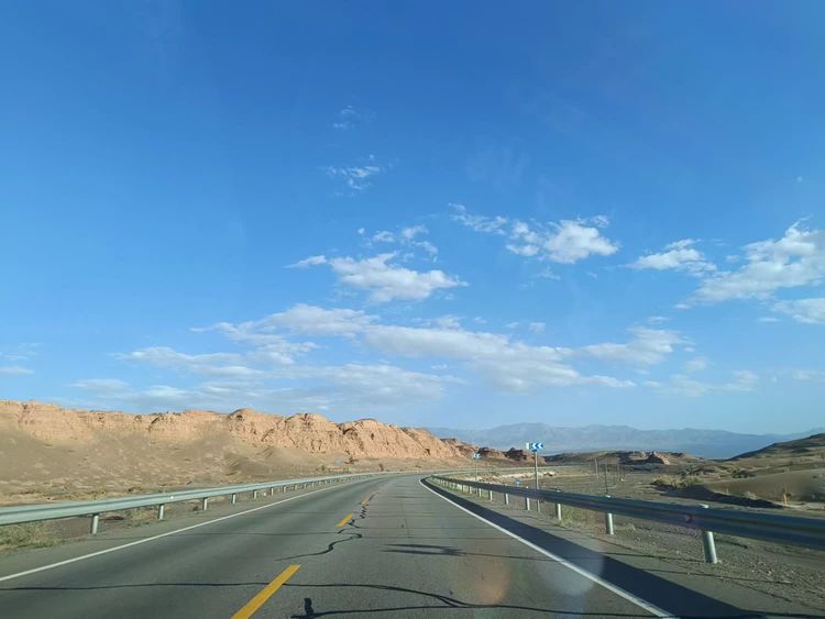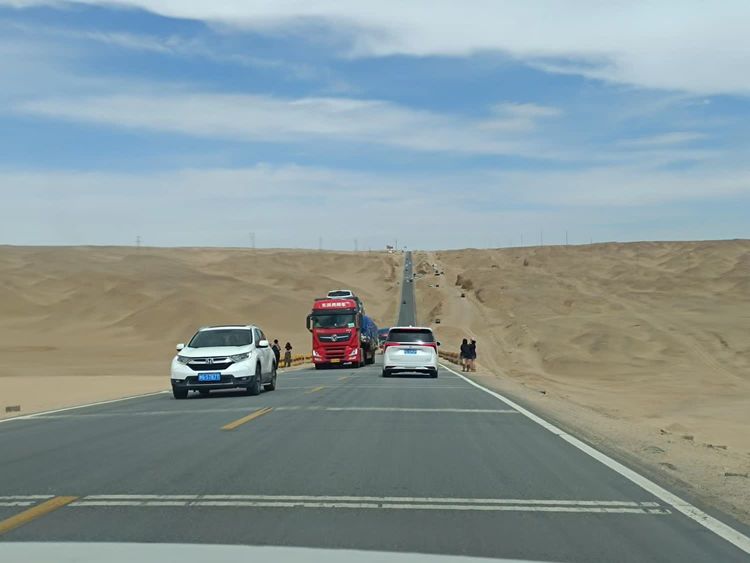 从阿克塞出来,路上基本都是沙漠戈壁的无人区,服务区很少,要跑238公里外的鱼卡服务区可以加油,所以一定要提前在阿克塞加满油,我们在路上就见到了没油被迫停驶,同行车正在想办法抽油的情况。另外,这一段高速上面有十字路口,所以一定要注意有没有车横穿高速。