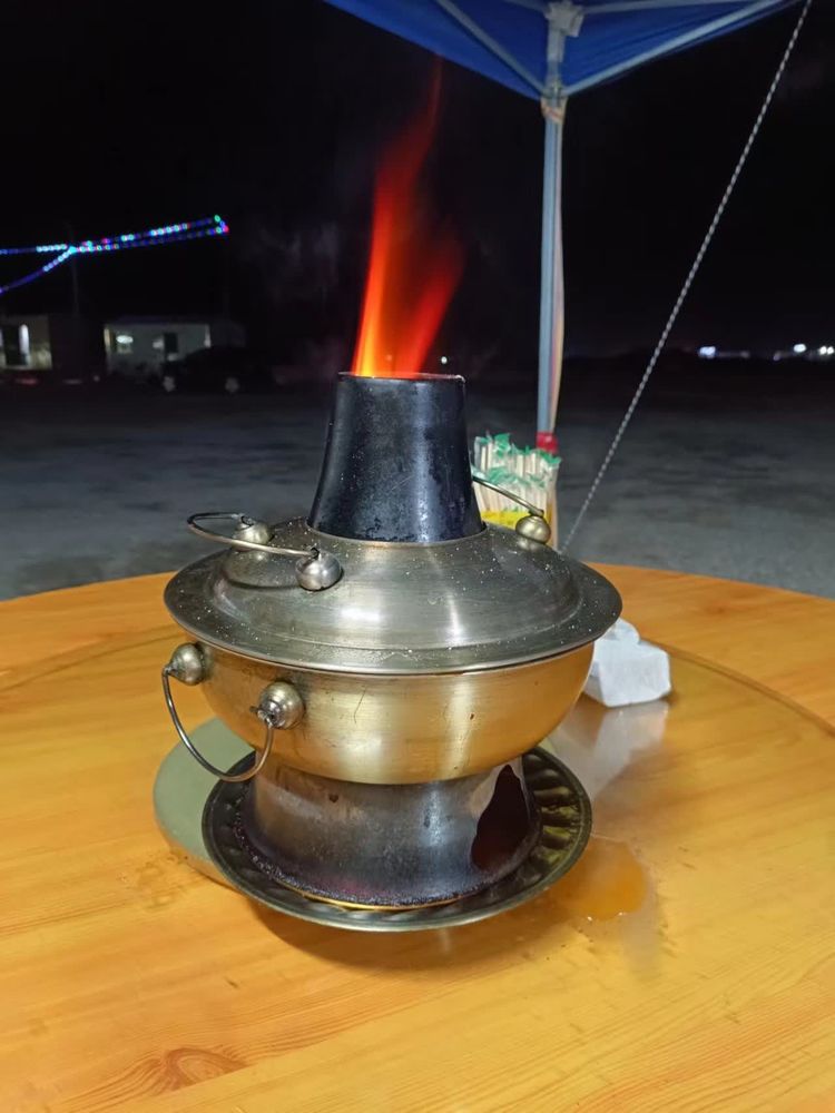夜里终于到达格尔木东台,这里是315国道无人区中的重要的补给站,有加油站、超市、商店、餐厅,还有一些宾馆酒店。我们住的格尔木东台房车营地,点了一个当地人叫的坑锅,也就是云南人叫的炊锅,火锅。