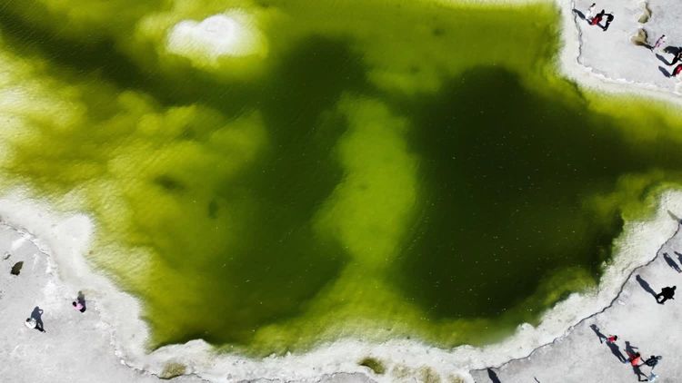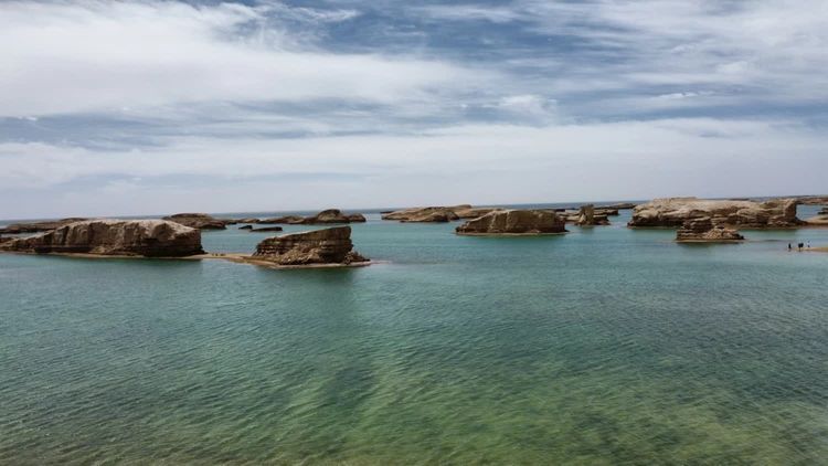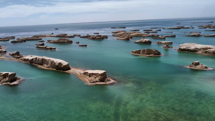 水上雅丹的水的颜色会根据天气发生相应的变化,但一般是以墨绿色或蓝色居多,同一时间人站在湖边看是蓝色的,但从小飞机上看则变成了墨绿色。