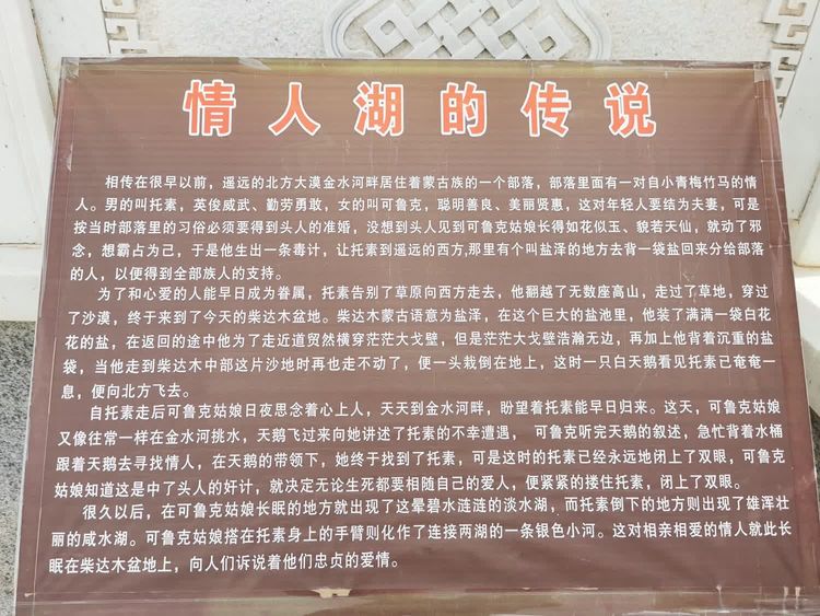 情人湖20元的门票,其中游客到的可鲁克湖是淡水,远处被隔开的托素湖是咸水湖,中间相连。情人湖景色非常不错的,又在高速边,人比较少,路过时可以去看看。同时这个湖也是青海戈壁和绿洲的分界点,从这个湖以西基本上是无人区和戈壁,以东则逐渐出现了灌木丛和树林、草地。景区不大,游览时间1-2小时。