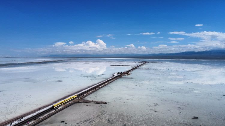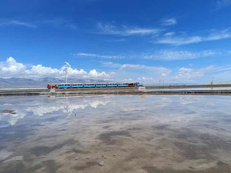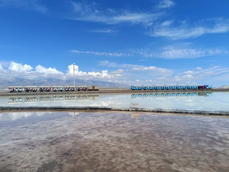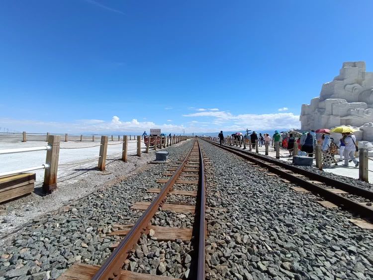 茶卡盐湖著名的小火车,以排队时间长而闻名,景区售票处的小姐姐人很好,不卖给我们火车票,而是说你自己进去看,如果你能等得到上车你再买。进去一看,大约排队需要一个半小时,果断放弃步行进入。