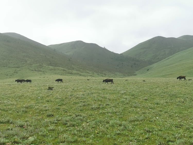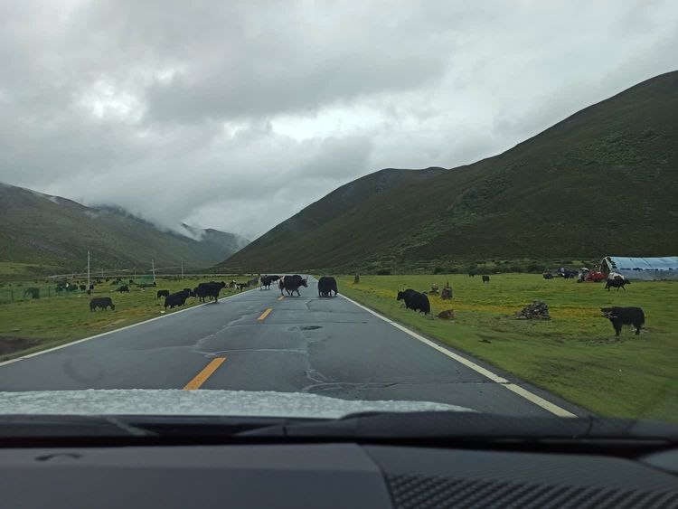 惊喜来了,549国道到乡城县城后,离开国道,沿着462省道前往稻城亚丁,路上一下子就没有了车,我们孤零零的开了几十公里,又在大雨中孤零零的爬了4500米的尼索拉山口,出现在眼前的就是一个大大的草原山谷,山谷长约5、6公里,宽约1公里,郁郁葱葱的草原上散落着众多牦牛。关键是这些草场都是开放式的,没有围栏,免费,一路上也没有车,特别惊喜。美中不足的是一直下雨,不好拍照片,也放不了小飞机。