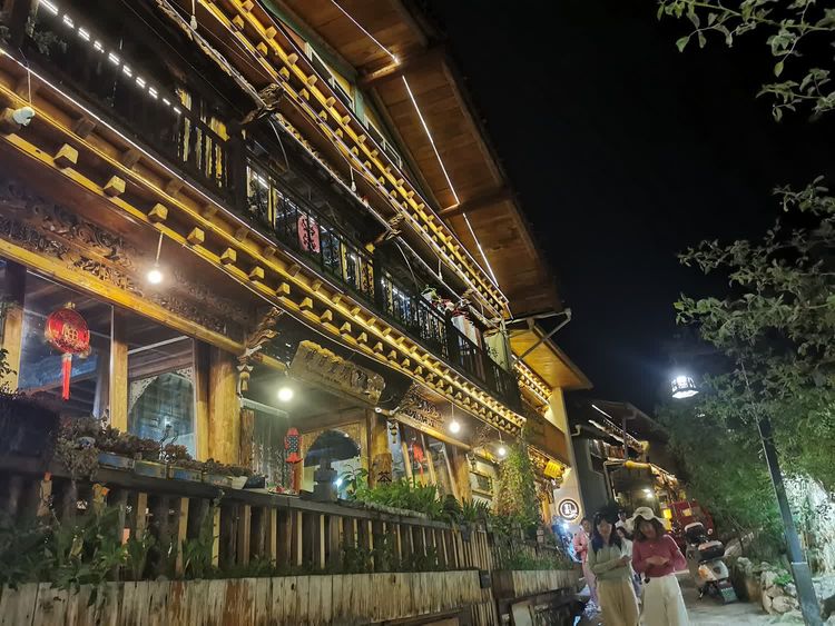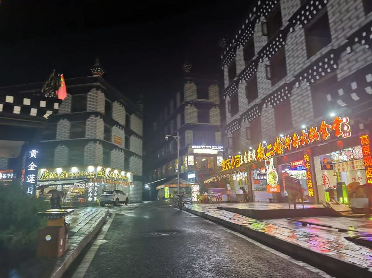 因为下雨,开得慢,天黑前到达稻城县香格里拉镇。这里说明一下,稻城亚丁景区指的是稻城县香格里拉镇的亚丁村景区,简称稻城亚丁。香格里拉镇海拔2700米,亚丁村海拔约3900米,亚丁景区从3900-4200米,所以大部分游客选择住在香格里拉镇,距离景区游客中心约4公里。照片中是香格里拉镇上餐厅比较集中的洛克小路。