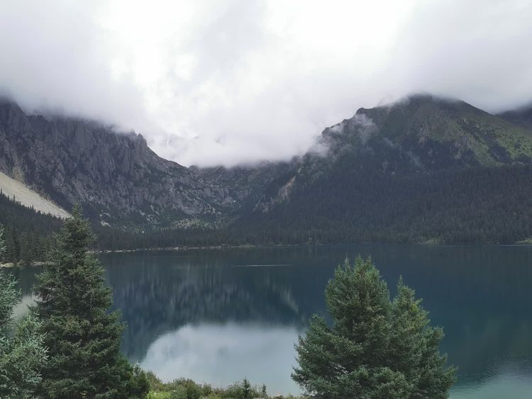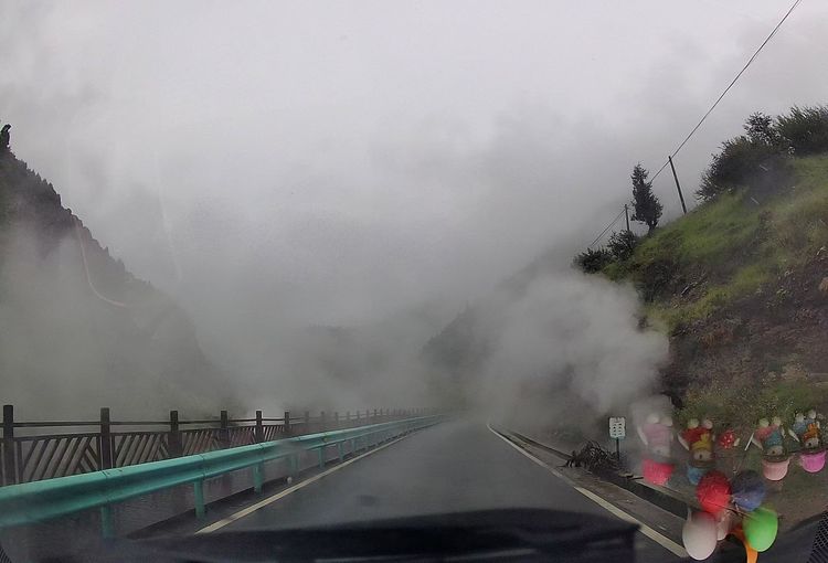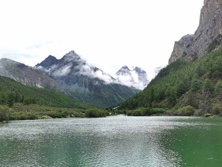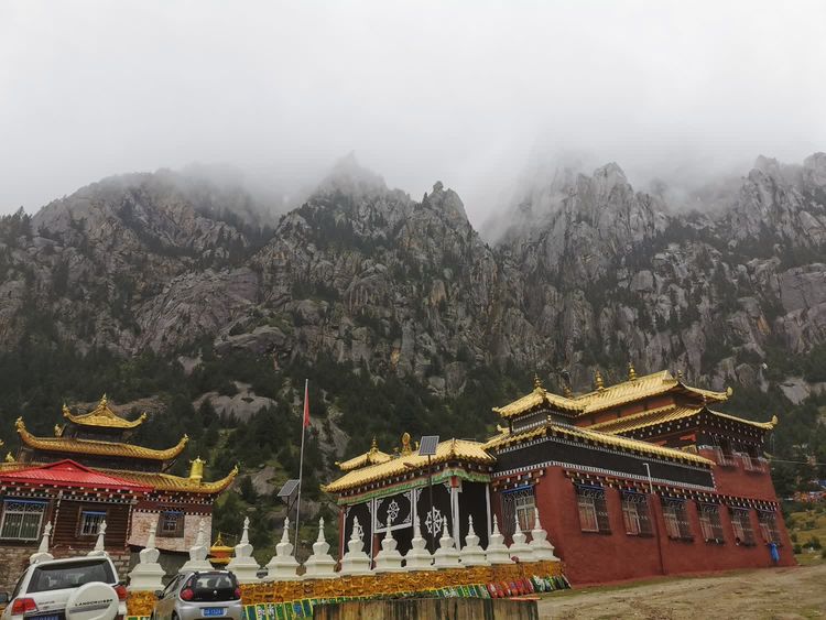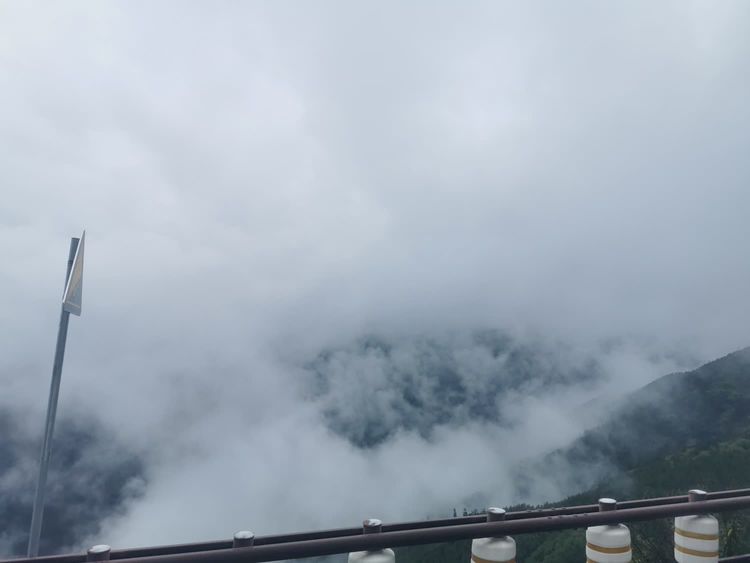 车辆停在景区停车场,然后坐50分钟的景区大巴前往亚丁景区,一路上很险峻,悬崖深达千米,由于大雾,邻近的几座雪山都躲在雨雾中,看不到。