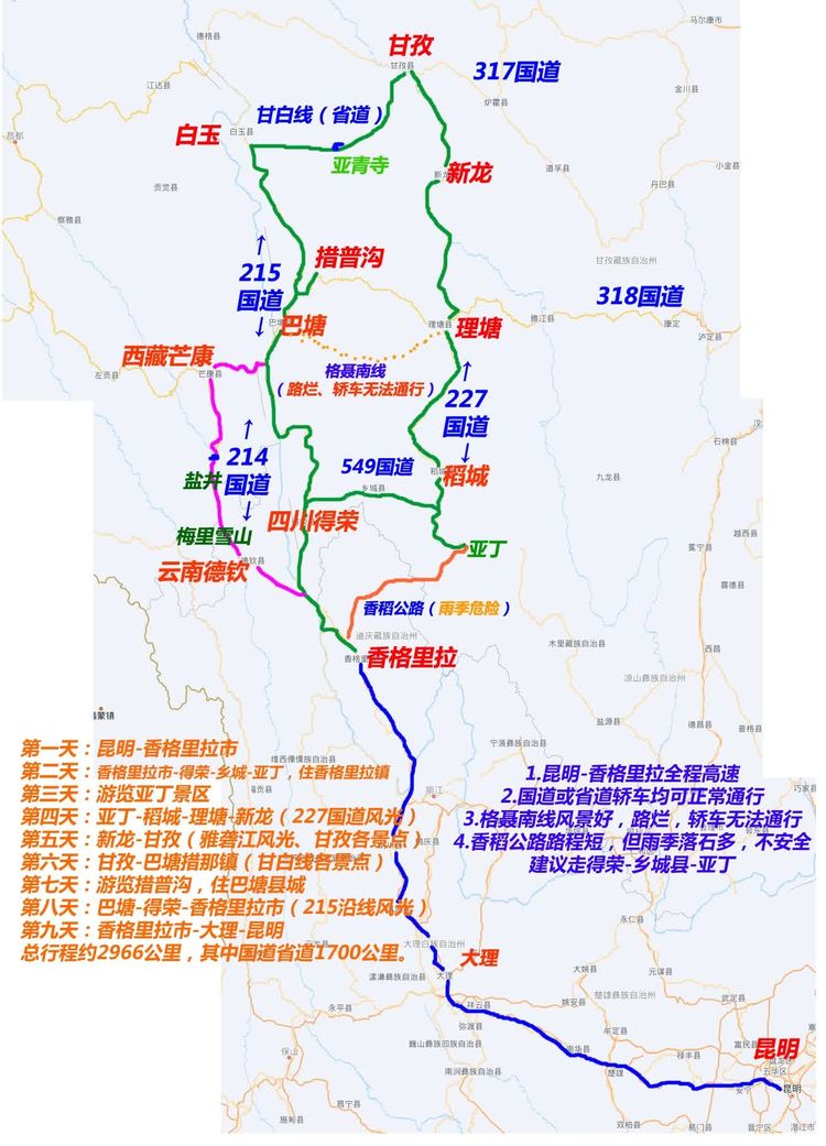 整个行程如上图所示,全程2966公里,其中昆明-香格里拉之间为高速,香格里拉以北为国道或省道。