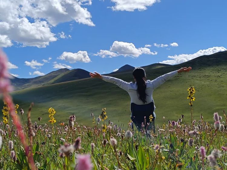 离开土拨鼠的峡谷,继续前进,就闯进了一片漫山遍野的花海中,垭口海拔4500米,找地方靠边停车,拍照打卡。