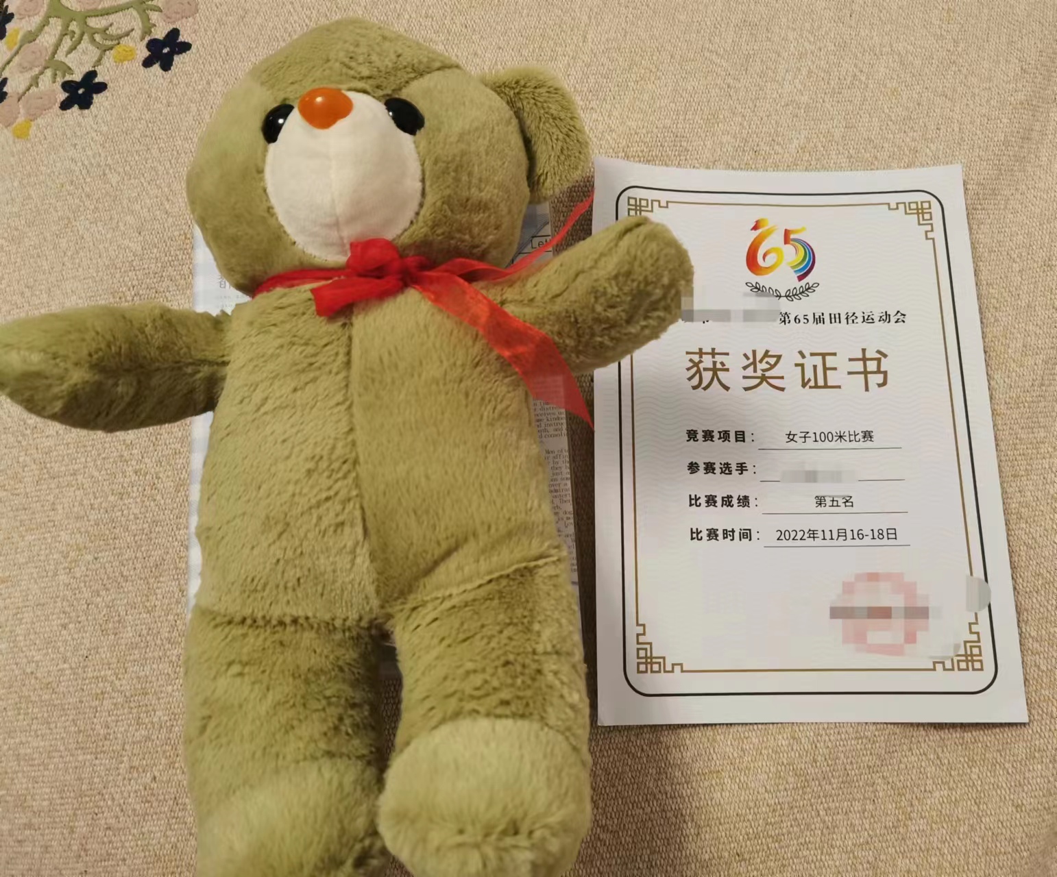2022年11月16-18日,萝莉在学校冬季运动会上女子100米短跑中获得年级第5名,不错。前3名都是专业体育生,能取得这个名次很满意。熊熊市奖品。