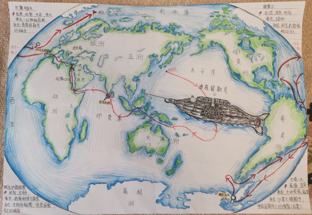 萝莉的语文作业,绘出海底两万里的线路图。萝莉周末花心思画出来了,我却认为可以简单一些,不用耗费太多时间,萝莉不同意。然后这个图片作为优秀作业被弄了年级展示,放学后萝莉摇头摆尾的回来,兴冲冲的表示还好没听我的话。哈哈。