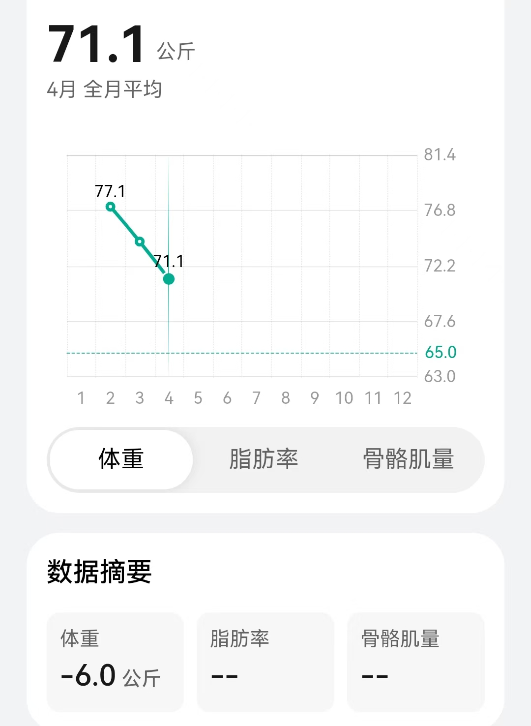 我的体重最近几年一直在波动,最轻是2020年,为了去西藏而减重到了66公斤,然后就在70上下徘徊,到2024年5月体检达到了74公斤,然后一个冬天就经常吃烤豆腐,春节又是大吃大喝,悲催的事情发生了,2月份发现衬衣变紧,21年买的西装都穿不进去了,一称,马上78公斤,吓了一大跳。。于是下定决心减肥,到今天4月10日,早上体重将到了70公斤,差不多就是减了快8公斤的样子,现在是轻松了很多,有2件买来就穿不进去的衣服也可以穿了,值得记录一下。