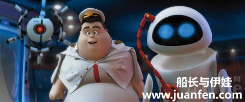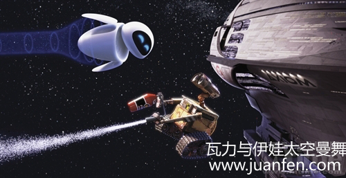 三、探索人工智能及其情感。人工智能是个老话题了,很多影片都探讨过,但都羞羞答答,要花很大的力气去解释为什么机器人会带有情感。但是在《WALL-E》中,导演不再探讨这个话题,影片中,机器人天然就有情感,他们也会有喜怒哀乐,特别是对异性的朦胧感情,甚至是对自己饲养的宠物——小强,都有丰富的情感。甚至为了把绿色植物带给飞船的舰长,正邪机器人之间都有了斗争,这就超过了其他电影对机器人情感的描述,至于为什么机器人会有那么丰富的情感,影片没有说,但是卷粉觉得,电影中其实已经告诉我们了,那就是:既然人类自己都可以事事依赖机器人,甚至丧失了自己的行走能力,那么,能为你提供那么多优质服务的机器人,为何就不能有自己的情感呢?
